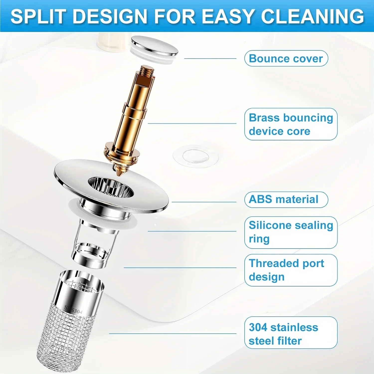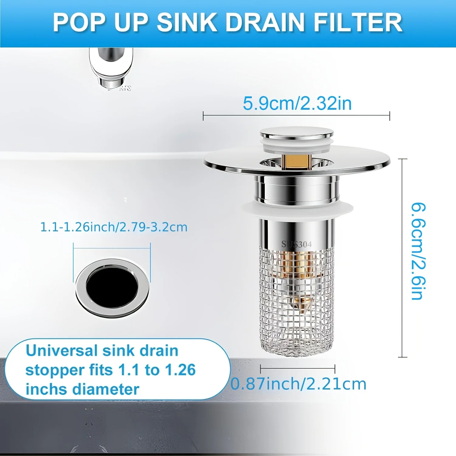 Upgrade your sink with this sleek and efficient universal pop-up drain stopper designed for modern bathrooms. Featuring a built-in spring core mechanism, it allows for easy push-to-open and close functionality, eliminating the need for traditional lift rods. The integrated filter basket effectively catches hair, debris, and small particles, helping prevent clogs and keeping your drain flowing smoothly. Designed to fit most sink drain holes between 1.1 and 1.45 inches, it offers a versatile and hassle-free installation. Crafted with a durable silver finish, it adds a clean and polished look to your sink area while resisting rust and wear. The removable design makes cleaning quick and simple, ensuring long-lasting hygiene and performance. Ideal for everyday use, it combines convenience, durability, and practicality in one compact solution. Perfect for upgrading or replacing old drain stoppers, this accessory enhances both functionality and style in your bathroom.
